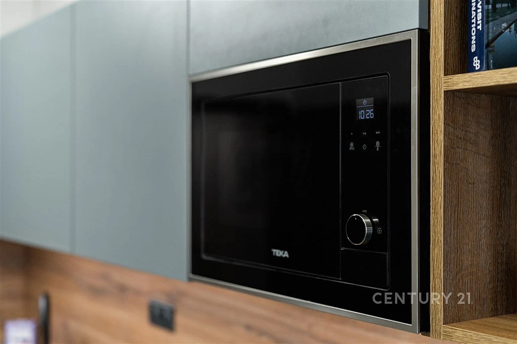 Je kompletně vybaven a zařízen: kuchyňská linka na míru včetně vestavěných spotřebičů (vysoká lednice s mrazákem, indukční varná deska, mikrovlnka, trouba, digestoř, myčka nádobí), jídelního stolu, židlí, sedačky, TV skříňky, vestavěnou skříní s pračkou a samostatnou sušičkou v předsíni, pracovním koutem, vestavěnými skříněmi a postelí box spring v ložnici.