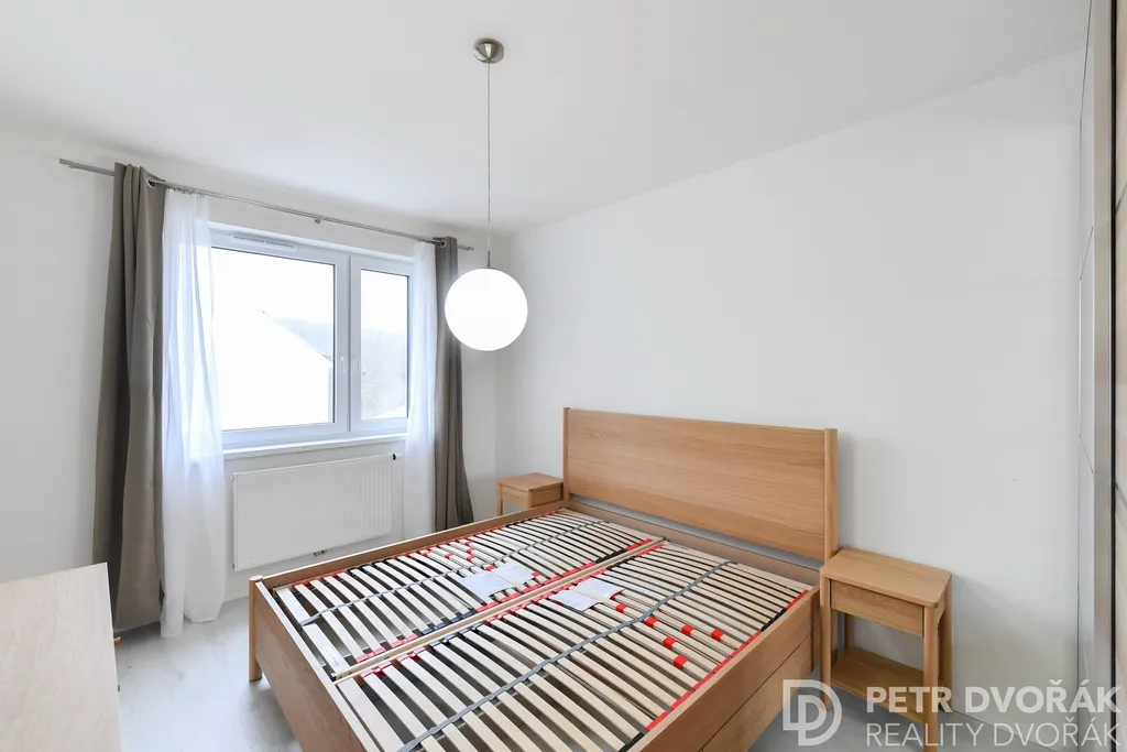 Ložnice disponuje manželskou postelí s lamelovými rošty, dvěma nočními stolky, prostornou šatní skříní s posuvnými dveřmi a zrcadlem a komodou se zásuvkami. Pokoj je světlý díky oknu orientovanému do klidného okolí.