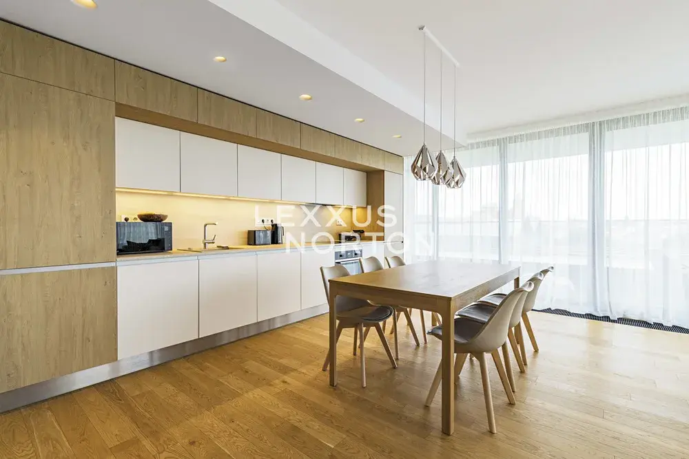 Tento reprezentativně zařízený byt s moderním interiérem je vybaven klimatizací a vestavěnými skříněmi. Kuchyňský kout disponuje kompletním vybavením – sklokeramickou deskou, troubou, lednicí s mrazákem a myčkou nádobí. Byt nabízí dvě designové koupelny – jedna je vybavena vanou a toaletou, druhá sprchovým koutem, toaletou, pračkou a sušičkou.