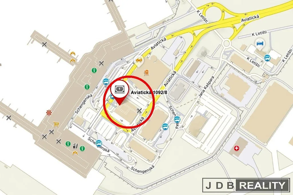 Nabízíme pronájem kanceláří umístěných v moderní budově nacházející se nedaleko hotelu Courtyard Marriott, naproti Terminálu 1 a 2 v areálu letiště Václava Havla. Terminál 2 je s budovou přímo propojen nadúrovňovým můstkem. Centrum disponuje plně vybavenými kancelářemi různých velikostí, zasedacími místnostmi a business salonkem, společnými prostory s kuchyňkou a recepcí. V blízkém okolí se nachází několik restaurací a kaváren.