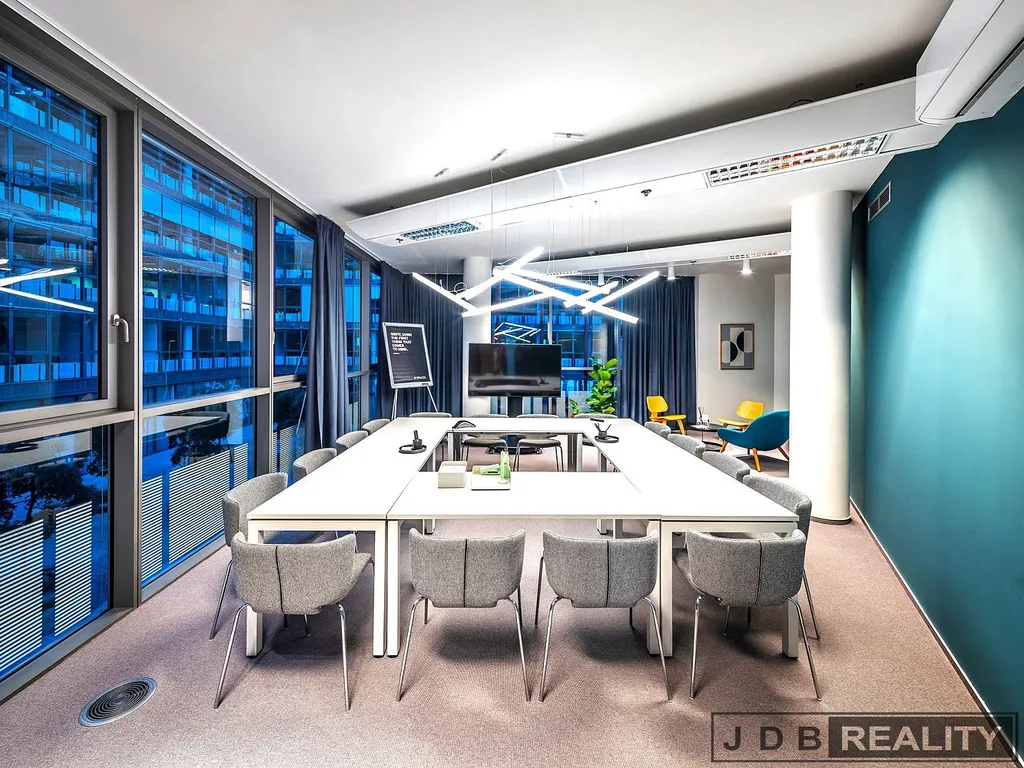 Nabízíme moderní soukromé kancelářské prostory 10m² + 50m² sdílené kancelářské prostory v budově Nile House, která je součástí projektu River City.