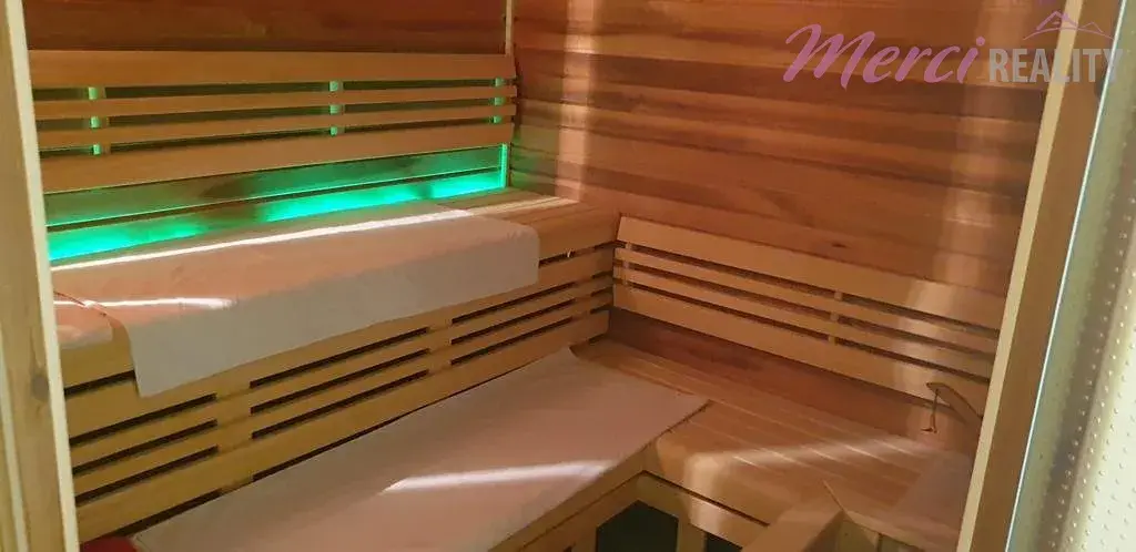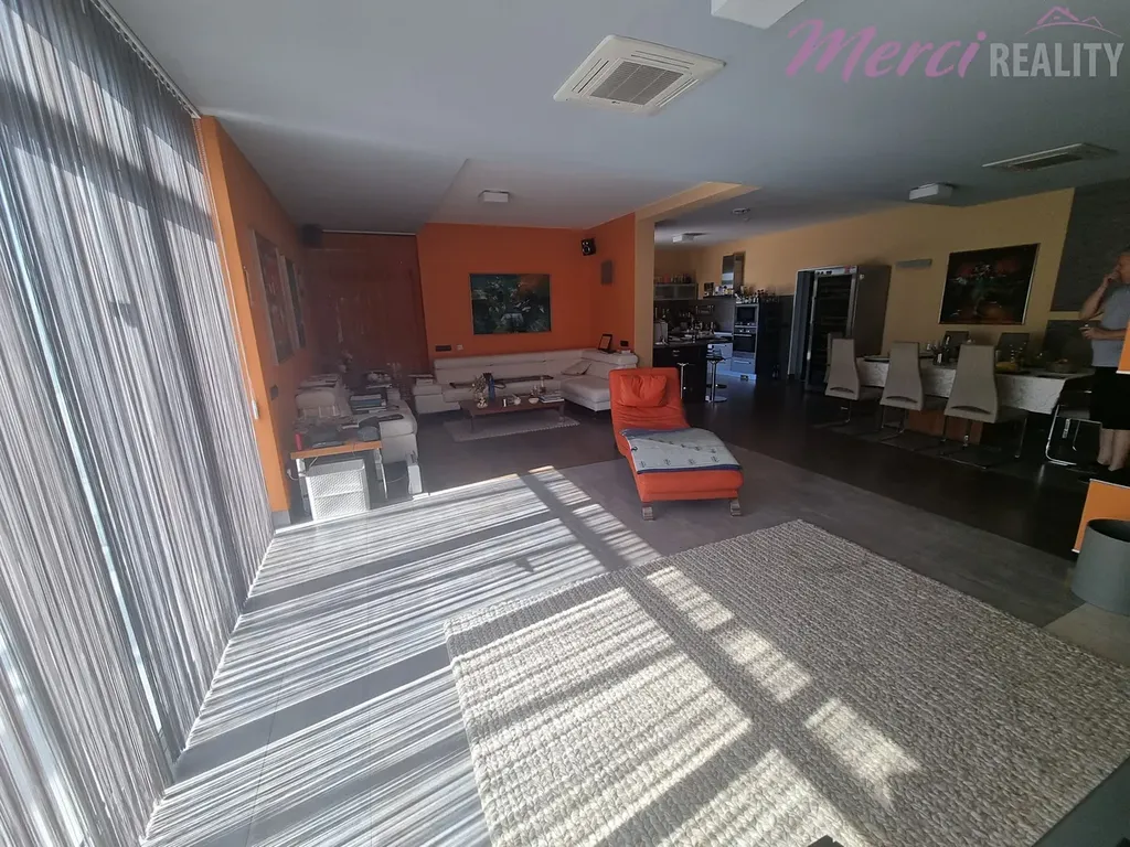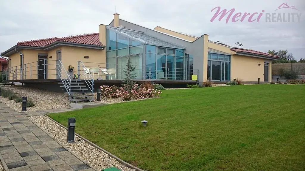 Nabízíme Vám k prodeji rodinný dům 5+1 typu bungalov o užitkové ploše 436 m2. Pozemek o celkové ploše 2144 m2 je kompletně oplocený. Při výstavbě byly použity nejkvalitnější stavební materiály a nejpokrokovější technologie dostupné na zahraničním trhu. Je zde také centrální vysavač, audio-video síť po celém areálu i spolu s WIFI sítí. Dále kamerový systém s pěti barevnými digitálními kamerami, uzamykací systém QUARD, klimatizace, vzduchotechnika, podlahové vytápění. Srážková a splašková voda po úpravě v biolog. čističce je všechna využita pro závlahu okrasné a ovocné zahrady. Na izolaci byl použit nejkvalitnější nehořlavý STYRODUR. V domě se nachází 5 pokojů, technická místnost, zimní zahrada, bazén, sauna, garáž a terasa. Na pozemku se nachází zahradní dům, který slouží jako zázemí pro sportoviště. Je zde venkovní posezení, kuchyňka, sociální zařízení a na terase je sezení pro 12 osob a diskrétní sprcha s teplou vodou. Součástí je také sklep pro skladování vína, ovoce a zeleniny. Nachází se zde multifunkční hřiště určené k provozování sportů jako tenis, fotbal, bedminton a nohejbal. Hřiště má umělý koberec o výšce 10 mm a je odkanalizované. Celé hřiště je ozvučené a osvětlené.