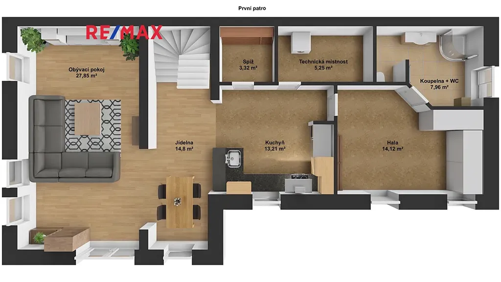 Součástí přízemí je také spíž, koupelna se sprchovým koutem a toaletou a praktická technická místnost.