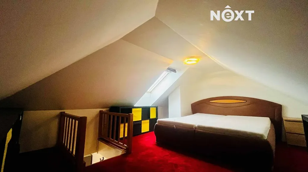 Do horního patra vede schodiště, kde se nachází ložnice .Patro je odděleno od denní části bytu a poskytuje klidovou zónu pro spaní nebo práci.
