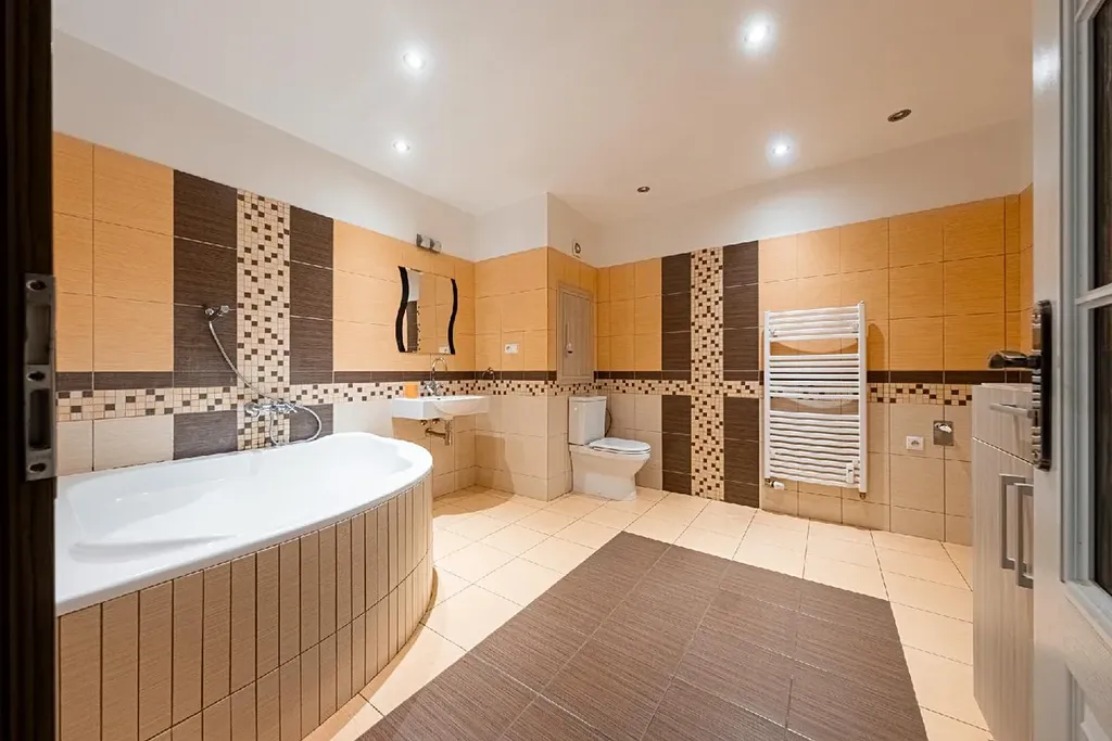 Velikostně opravdu nadstandartní koupelna disponuje rohovou vanou, umyvadlem se zrcadlem, WC, topným žebříkem, komodou, prostorem a připojením pro pračku a sušičku.