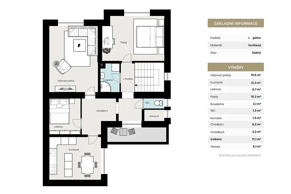 Dispozice domu je ideální i pro vícegenerační bydlení nebo rozdělení na dvě samostatné jednotky, například pro kombinaci vlastního bydlení a pronájmu. Dům má dvě nadzemní podlaží. V přízemí se nachází čtyři místnosti, z nichž tři jsou neprůchozí, což poskytuje dostatek soukromí pro jednotlivé členy rodiny. V patře je obývací pokoj, dvě ložnice, kuchyň a koupelna. V každém podlaží je k dispozici koupelna i samostatné WC, což výrazně zvyšuje komfort užívání domu. Nemovitost je téměř celá podsklepená a nabízí dostatek skladovacích prostor, technické zázemí i možnosti pro hobby či domácí dílnu.