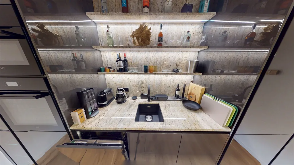 Kuchyňská linka s veškerými spotřebiči včetně potřebného vybavení (sklenice, talíře, hrnce atd.).