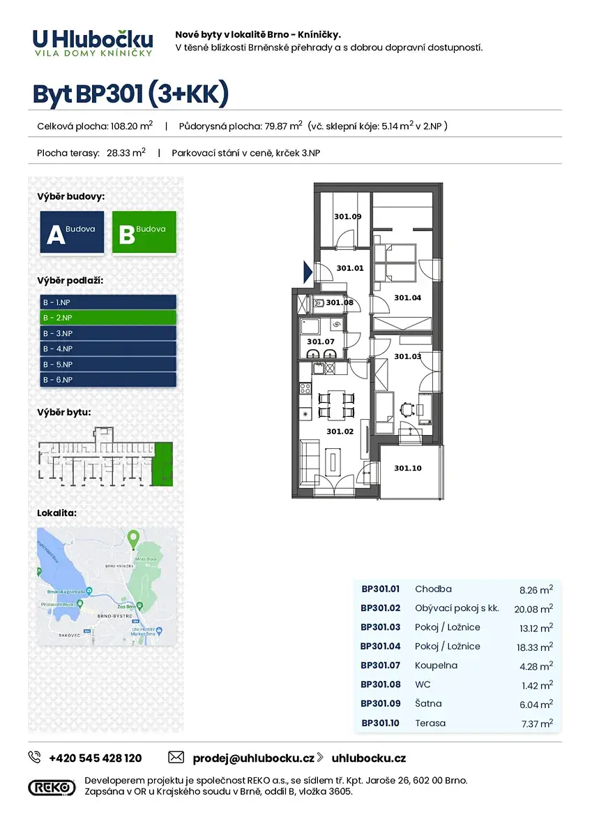 Nabízíme k prodeji byt o dispozici 3+kk s celkovou podlahovou plochou 74,73 m², který disponuje šatnou a dvěma terasami o celkové výměře 28,33 m². Byt se nachází v 2.NP moderního terasového viladomu s výtahem v projektu U Hlubočku, dům B, v atraktivní lokalitě Brno–Kníničky. Orientace bytu je na SV s krásným výhledem na Mniší horu. Kupní cena zahrnuje parkovací stání v domě.