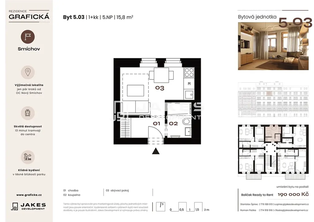 Nabízíme k prodeji byt 1+kk o ploše 15,8 m², umístěný v pátém nadzemním podlaží developerského projektu Rezidence Grafická. Byt je orientován do klidné ulice, což zajišťuje příjemnou pohodu a dostatek soukromí. Provoz v ulici Grafická je minimální, díky čemuž nabízí bydlení tiché a nerušené prostředí. Je ideální volbou jak pro vlastní bydlení, tak pro investici s dlouhodobým potenciálem.