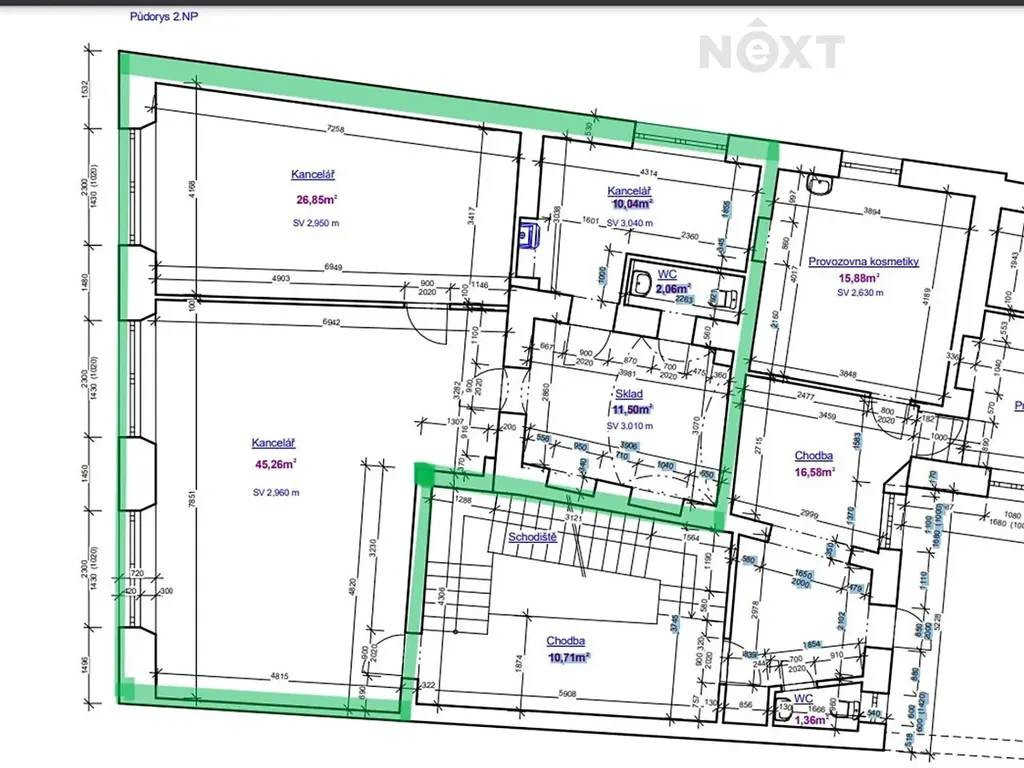 Exkluzivně Vám nabízíme k okamžitému pronájmu kancelářské prostory o výměře 96,71 m2 v domě přímo na Masarykově náměstí v samotném centru města Vyškova. Prostory jsou po kompletní rekonstrukci. Druhé nadzemní podlaží přístupné po schodišti zajišťuje příjemný výhled na historickou část náměstí. Jedná o uzavřený soubor několika místností, kde největší vstupní kancelář o výměře 45,26 m2 je průchozí a navazuje na ni samostatná místnost o výměře 26,85 m2. Obě tyto kanceláře mají výhled přímo na náměstí. Z největšího prostoru je dále vstup do průchozího skladu (11,5 m2) a z něho dále vstup do nové koupelny s umyvadlem a toaletou, která slouží pouze uživatelům těchto prostor. K dispozici je kuchyň (10,04 m2) vybavená novou kuchyňskou linkou, která je přístupná rovněž ze skladu. Kuchyň je situována do boční ulice. Podlahy v kancelářích jsou opatřeny novými koberci, v kuchyni a průchozím skladu je položeno nové lino s vinylovým povrchem.