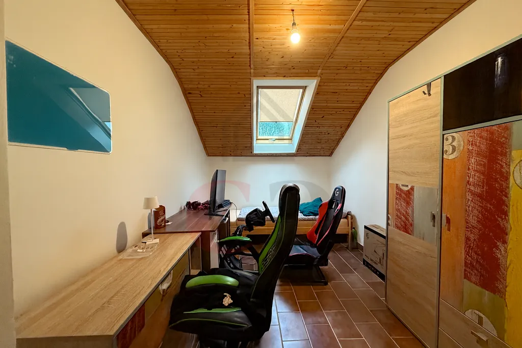 V patře domu jsou k dispozici čtyři pokoje, koupelna, toaleta a šatna.