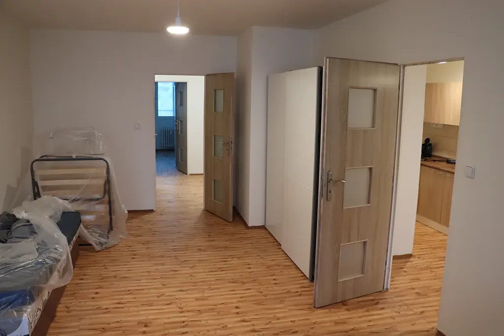 Byt nyní prochází renovací a bude připraven k nastěhování v březnu 2026. Kuchyně je vybavena myčkou, sklokeramickou varnou deskou a horkovzdušnou troubou.