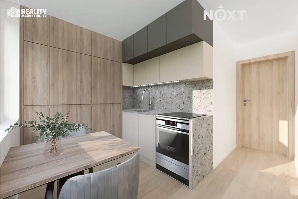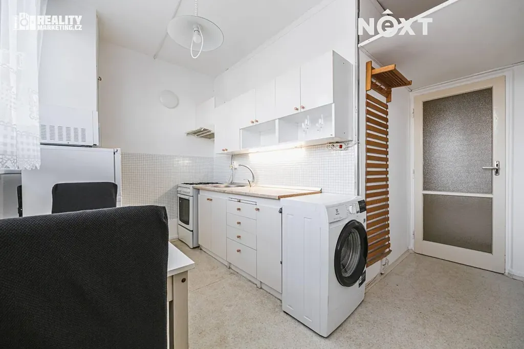 Plně funkční kuchyně je vybavena plynovým sporákem a připraveným prostorem pro pračku. Z kuchyně je přímý vstup do dalšího pokoje, který můžete využít jako jídelnu pro rodinná posezení, dětský pokoj, pracovnu pro home office apod.