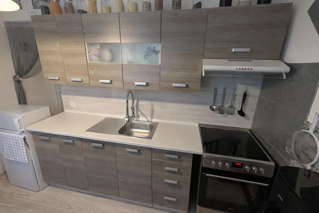 Kuchyň je vybavena hezkou kuchyňskou linkou a elektrickým sporákem s digestoří. V koupelně je vana s umyvadlem, WC odděleno..
