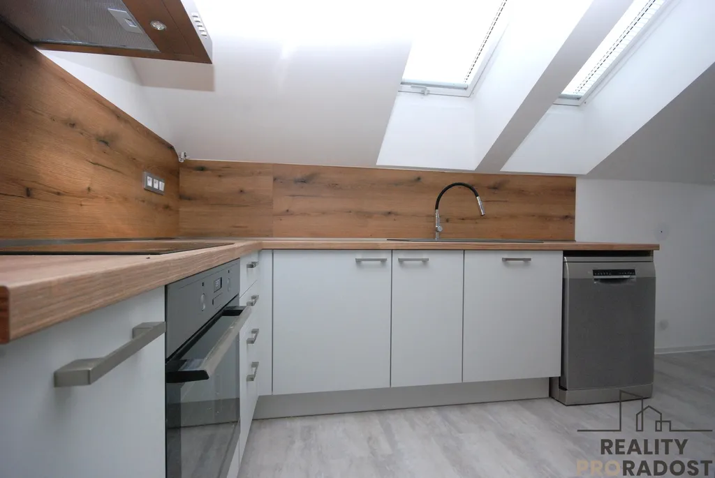 Kuchyňská linka je ve tvaru L, vybavená spotřebiči - myčka, sklokeramická varná deska, elektrická trouba, digestoř, lednice.