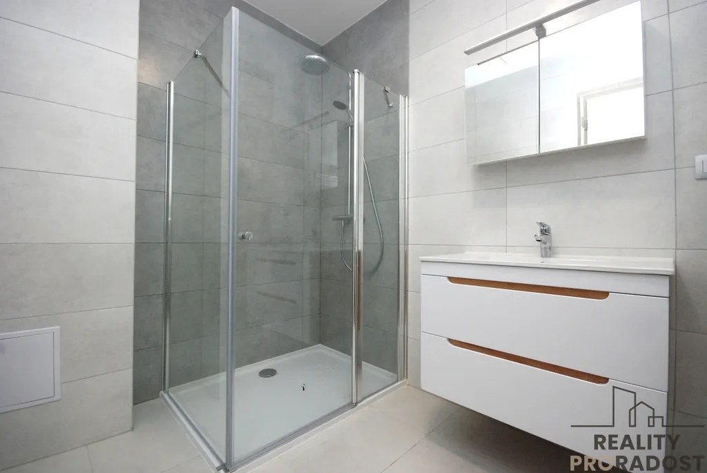 V bytě jsou plastová okna - trojskla se žaluziemi. Na podlaze vinylová podlaha. V koupelně obklady a dlažba.