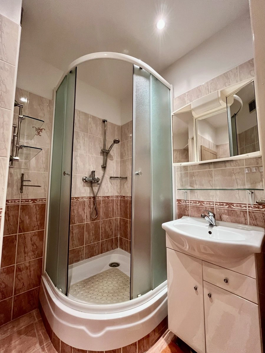 V koupelně najdeme sprchový kout i toaletu, umyvadlo a pračku.