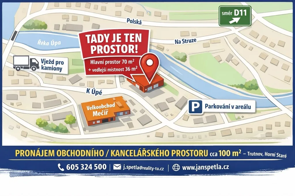 Nabízím k dlouhodobému pronájmu nebytový prostor o celkové výměře cca 100 m² v Trutnově – Horním Starém Městě, ulice K Úpě.