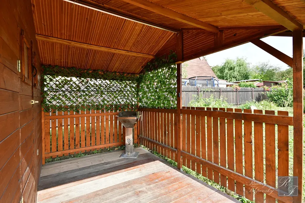Na zahradě je stavba bez č. p. i č. ev, zapsaná v katastru nemovitostí, se zastavěnou plochou 11 m2. Ta je využívána jako sklad zahradního náčiní. Dále se zde nachází dočasná stavba sloužící jako odpočinkové zázemí k zahradě s podlahovou plochu hlavní místnosti 13,6 m2 a verandou o výměře 6 m2. Tento objekt je v celkově velmi dobrém stavu a je opatřen i základním zateplením obvodového pláště.