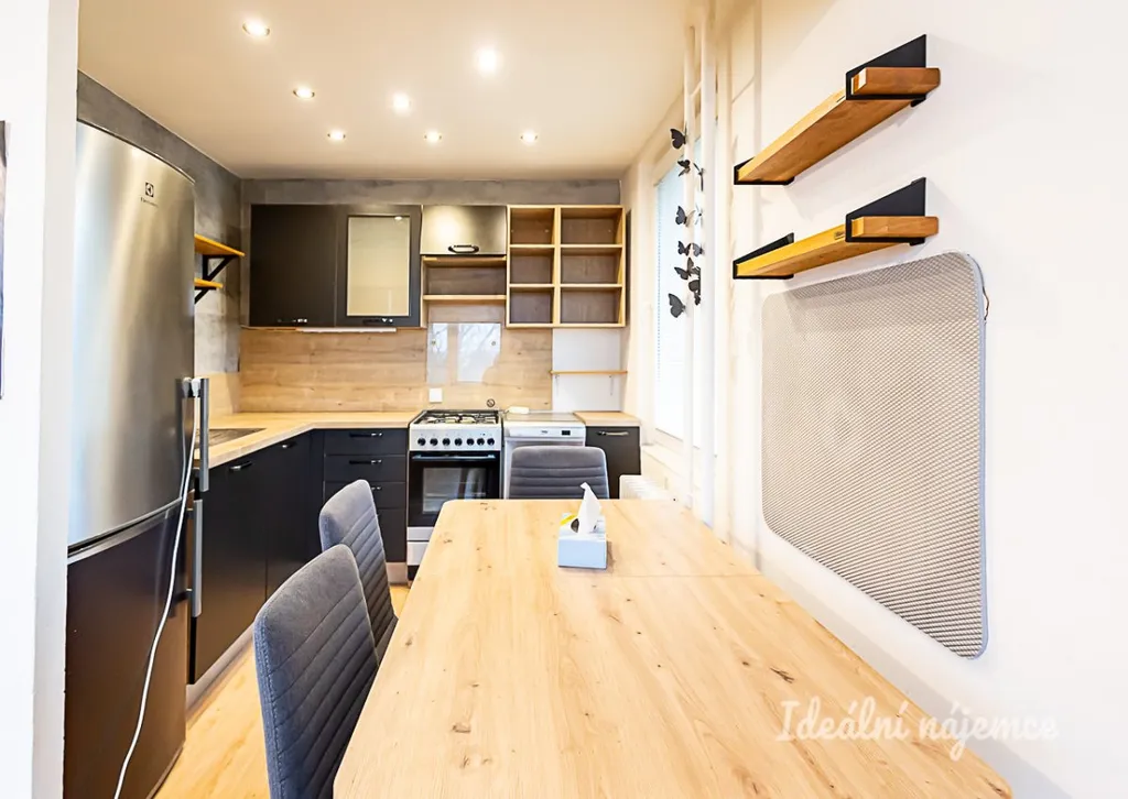 Byt je nabízen jako částečně vybavený, což představuje ideální příležitost pro ty, kteří si chtějí domov dotvořit podle vlastního vkusu a potřeb. Srdcem bytu je plně funkční kuchyně vybavená moderními spotřebiči včetně lednice s mrazákem, elektrické trouby, varné desky, digestoře a myčky, přičemž nechybí ani praktický jídelní kout. Dominantou bytu je rozměrný obývací pokoj zaplavený přirozeným světlem, který skýtá dostatek místa pro pohodlnou sedací soupravu i další nábytek. Druhý samostatný pokoj nabízí variabilní využití a skvěle poslouží jako klidná ložnice nebo inspirativní pracovna. Koupelna disponuje klasickou vanou a umyvadlem, zatímco toaleta je pro maximální komfort řešena samostatně.