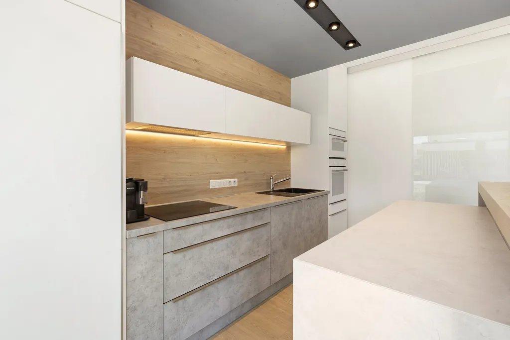 V přízemí se nachází prostorná vstupní předsíň, světlý obývací pokoj s velkoformátovými okny a vstupem na terasu, propojený s jídelnou a kuchyňským koutem. Okna jsou vybavena venkovními elektrickými žaluziemi, které zajišťují soukromí a tepelný komfort. Dále je zde pracovna, praktická komora a koupelna se sprchovým koutem.