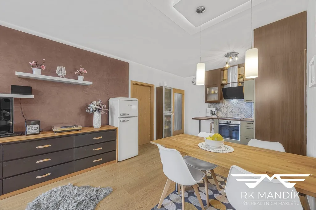 Obývací pokoj spolu s kuchyňským koutem (28,01 m²), který skýtá vestavěné spotřebiče (varná deska, digestoř, myčka nádobí, mikrovlnná trouba, elektrická trouba, kombinovaná lednice s mrazákem), nabízí dostatek prostoru, je vybaven jídelním koutem, pracovním koutem a praktickou vestavnou sklápěcí postelí. Dětský pokoj (12,67 m²) je prakticky řešen, úložný prostor zajišťuje šatní skříň, zbývá dostatek prostoru.