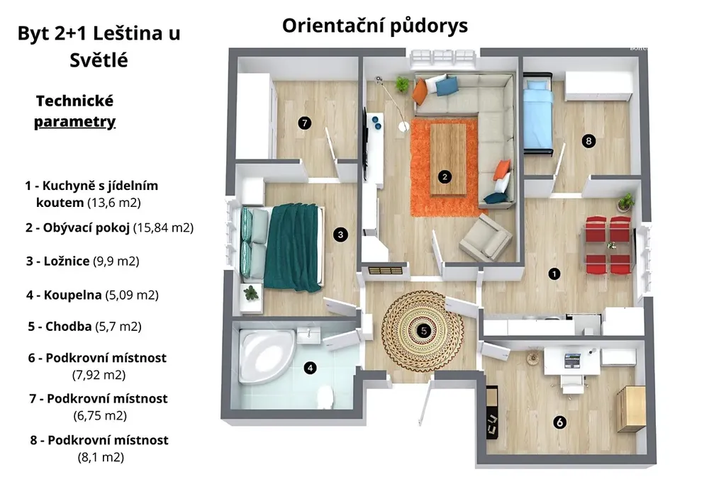 Nabízíme Vám ke koupi velmi pěkný podkrovní byt o dispozici 3+1 a celkové ploše 73 m2, který se nachází ve 3. podlaží zděného domu v centru obce Leština u Světlé.