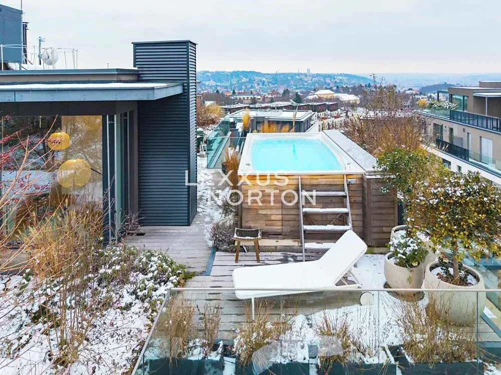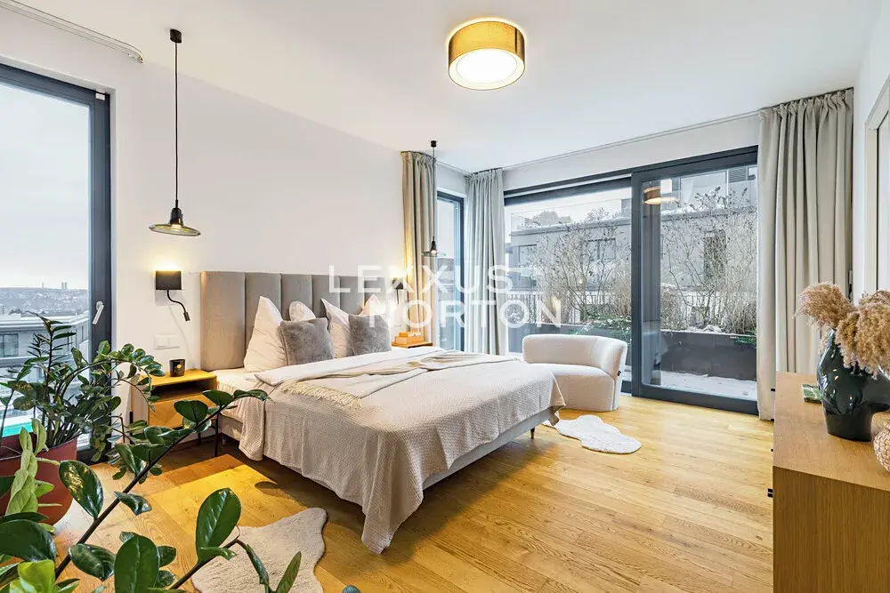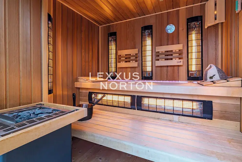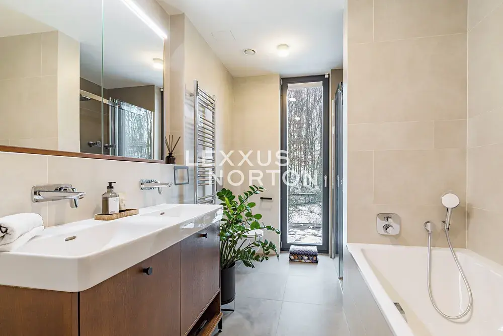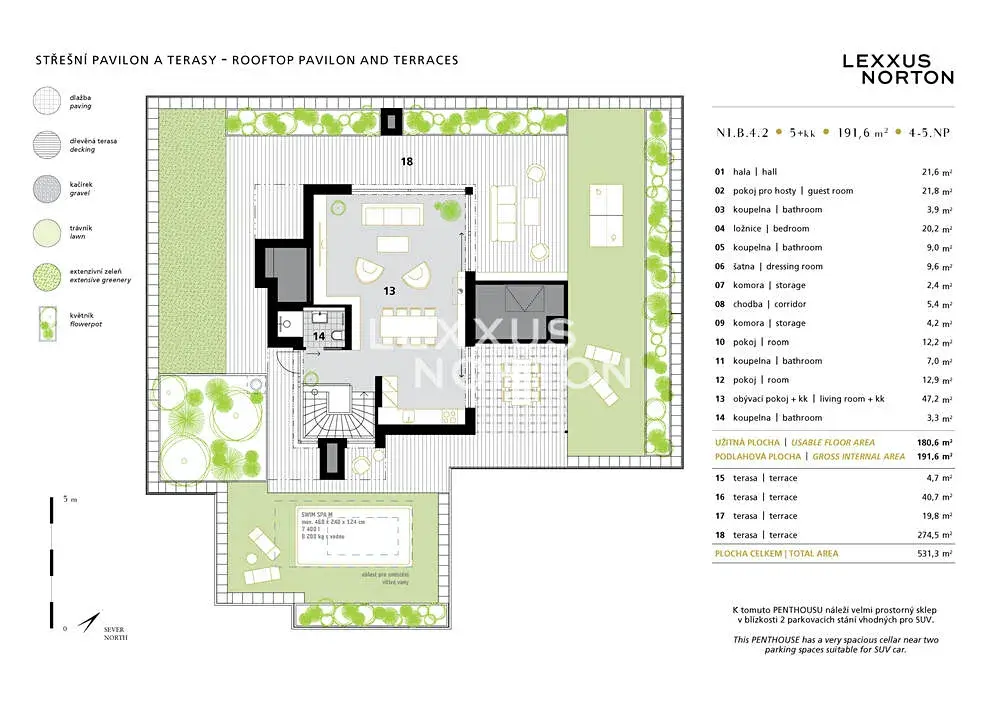 Součástí bytu je soukromý pětimetrový bazén s protiproudem a vyhříváním pro celoroční využití, kombinovaná finská/infra sauna a velkorysá střešní zahrada s bioklimatickou pergolou s naklápěcími lamelami a automatickým zavlažováním.