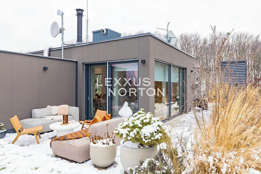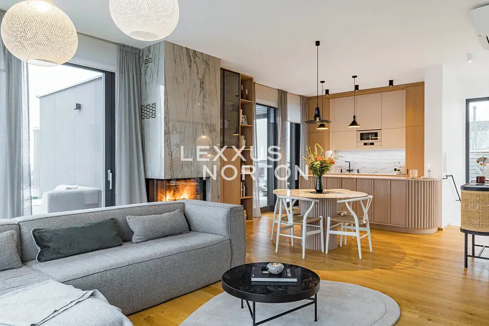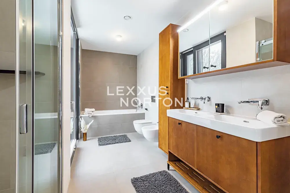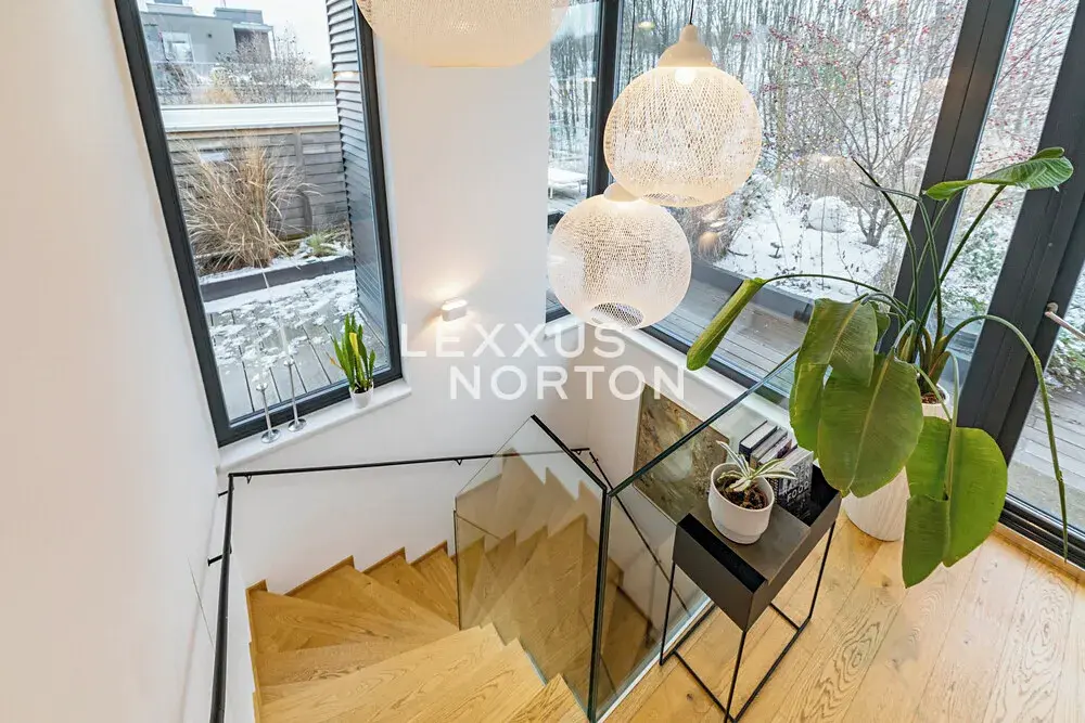 Interiér je vybaven vestavěným nábytkem na míru, designovými svítidly a kvalitními materiály. Standard zahrnuje masivní dřevěné podlahy, velkoformátovou dlažbu v koupelnách, dřevěná okna s izolačním trojsklem, podlahové topení, klimatizaci v každé místnosti a řízené větrání s rekuperací tepla.