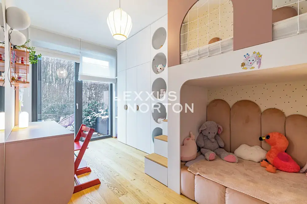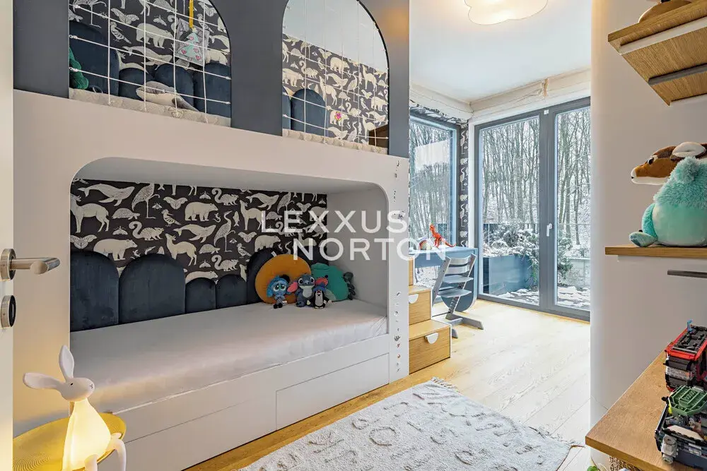 Byt je rozložen do dvou úrovní, které přirozeně oddělují společenskou a klidovou část. Vstupní podlaží vás uvítá prostornou halou se schodištěm, odkud se vstupuje do jednotlivých pokojů. Dominantou je hlavní ložnice s vlastní koupelnou, šatnou a přímým vstupem na terasu – ideální rodičovská master suite. Dále zde najdete dva samostatné pokoje vhodné jako dětské ložnice, pracovny či kombinaci obojího, doplněné o plnohodnotnou koupelnu. Benefitem je i oddělený pokoj pro hosty s vlastním koupelnou, který poskytuje návštěvě plnohodnotné soukromí.