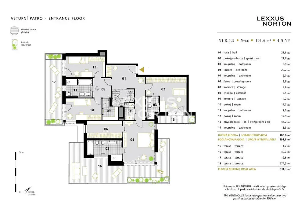 Tento velkorysý penthouse o dispozici 5+kk a podlahové ploše 191,6 m² se nachází v nejvyšších podlažích rezidence a nabízí přesně to, co se v Praze objevuje jen výjimečně: kombinaci absolutního soukromí, prostoru a výhledu na všechny světové strany.
