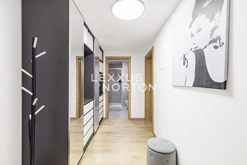 Byt se nabízí kompletně zařízený. Kuchyňský kout je vybaven lednicí s mrazákem, varnou deskou, troubou, mikrovlnnou troubou a myčkou. Koupelna je se sprchovým koutem a k dispozici je pračka se sušičkou. Byt je vybaven také systémem pasivního větrání - rekuperací vzduchu, která zajišťuje čerstvý vzduch a optimální klima. Navíc je k dispozici centrální regulace teploty, která umožňuje pohodlné a úsporné vytápění po celý rok.