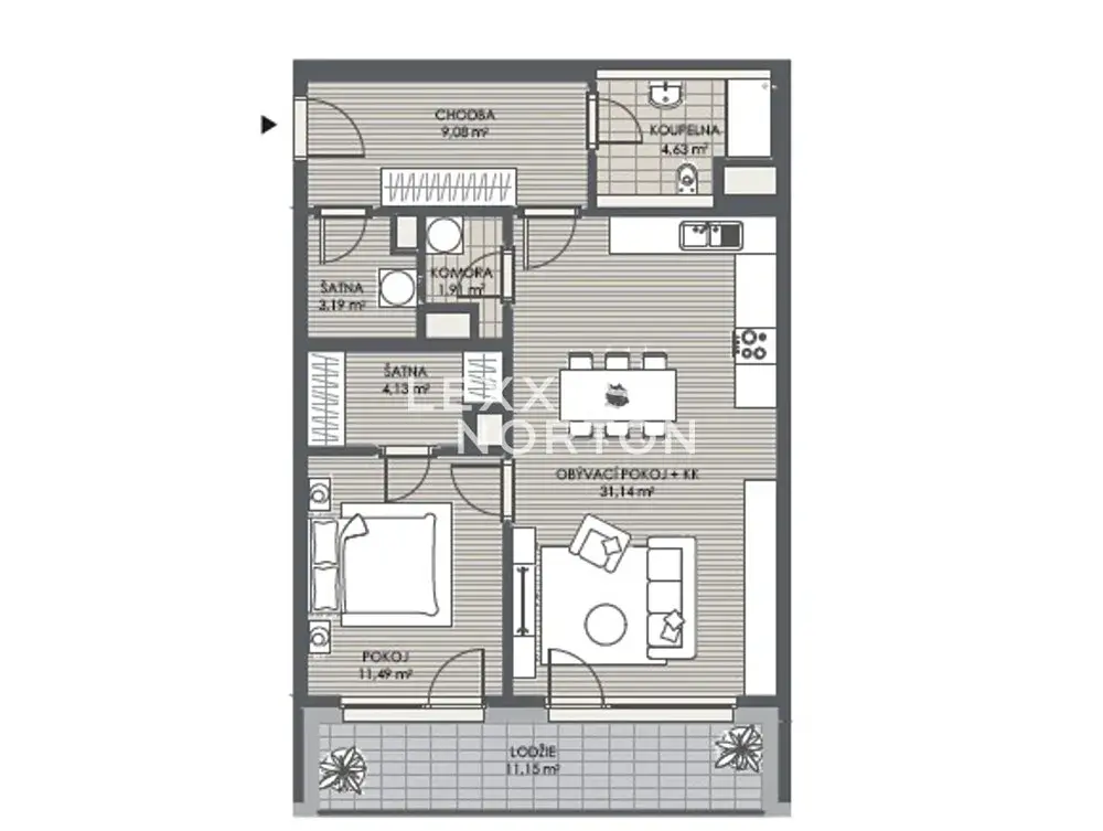 Byt se skládá ze vstupní chodby, šatny, obývacího pokoje s plně vybaveným kuchyňským koutem, komory, ložnice se samostatnou šatnou a koupelny s toaletou. Byt disponuje balkonem s přístupem z obývacího pokoje i ložnice. K bytu dále patří garážové stání a sklep.