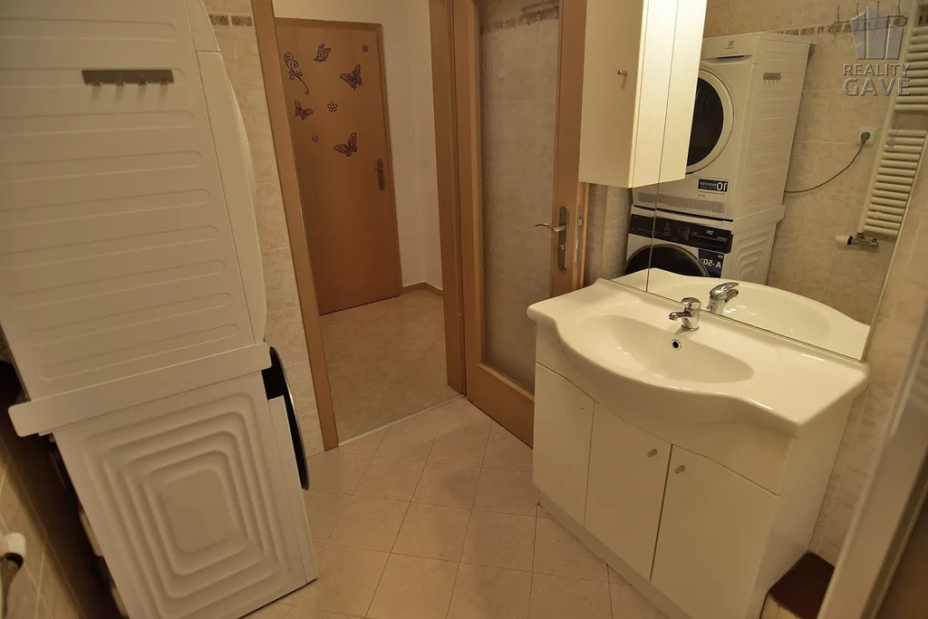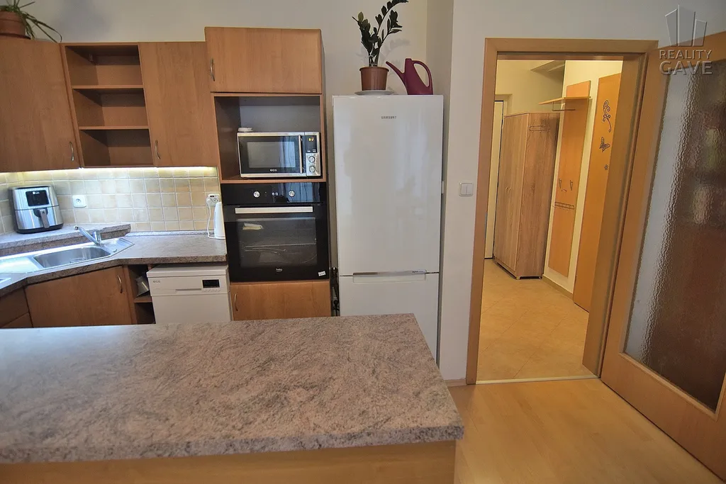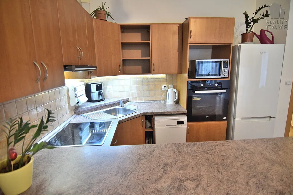 Interiér bytu je udržovaný a v dobrém stavu bez nutnosti nějaké zásadní a okamžité investice. Okna jsou euro dřevěná s izolačními dvojskly. Pozitivní je řešení rozdělení koupelny a toalety do dvou různých místností a velká šatna u ložnice. Kuchyňská linka má standardní vzhled i kvalitu a dostatek uložných prostor. Vybavena je sklokeramickou varnou deskou, digestoří s odtahem do komína, dále je zde vestavná trouba Beko, prostor pro mikrovlnku a volně stojící myčka.