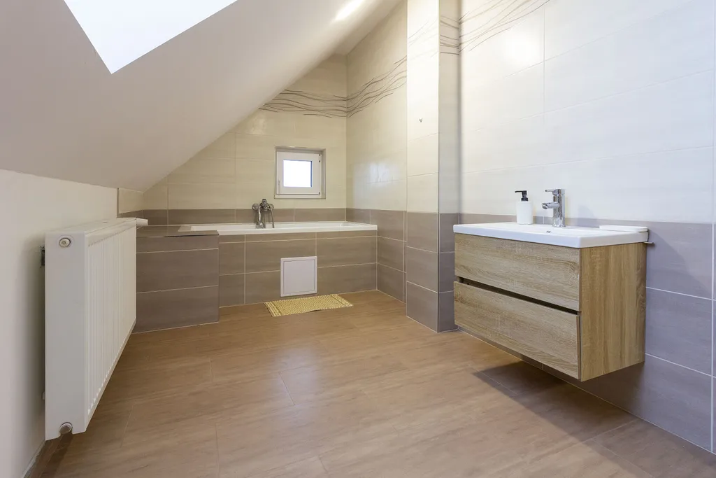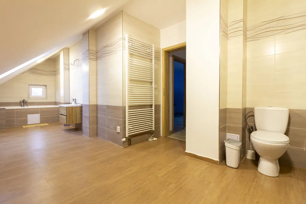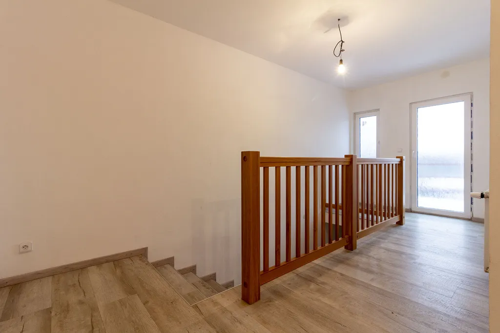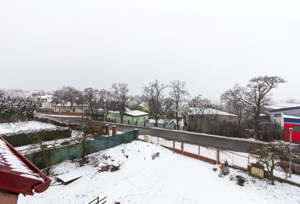 V 1. patře prostorná podesta se vstupem na balkón, dále pak koupelny s WC a dvou pokojů. Jedna místnost je pak průchozí s další menší, podkrovní místností.