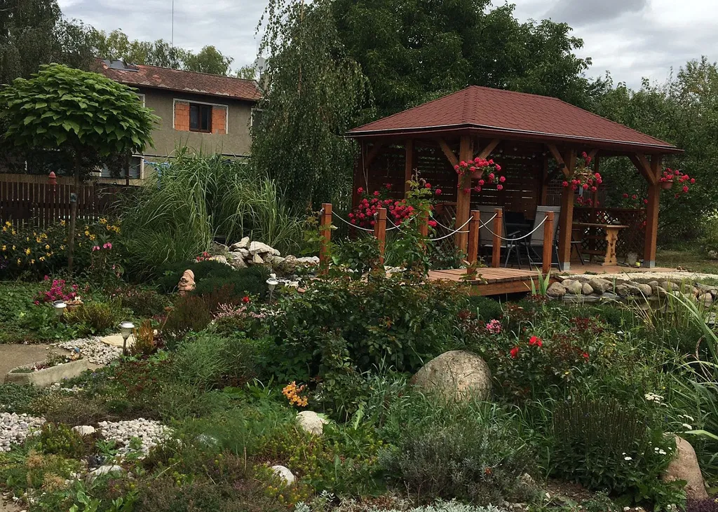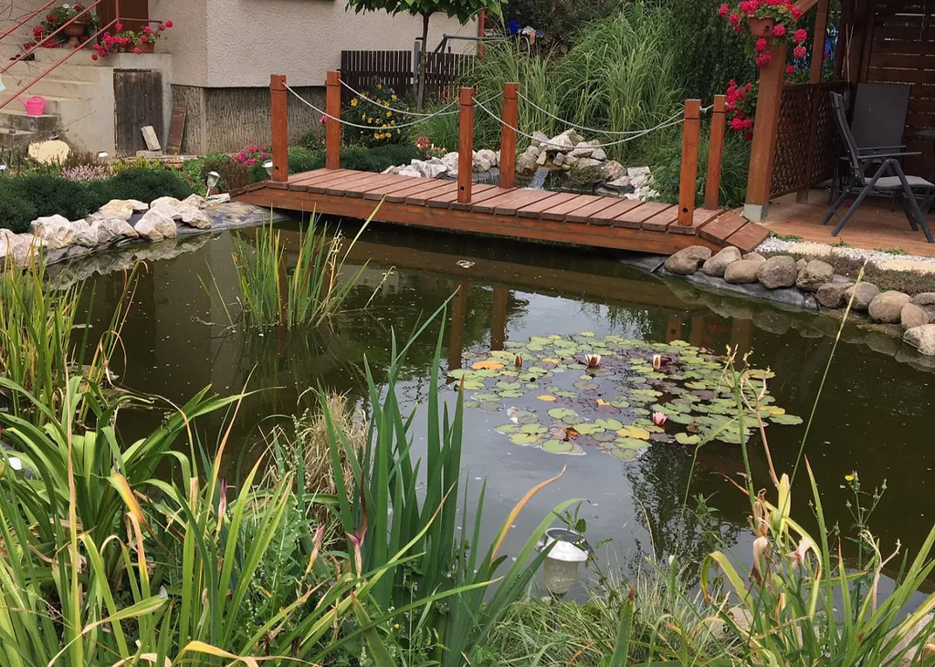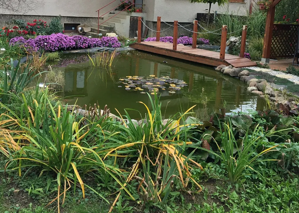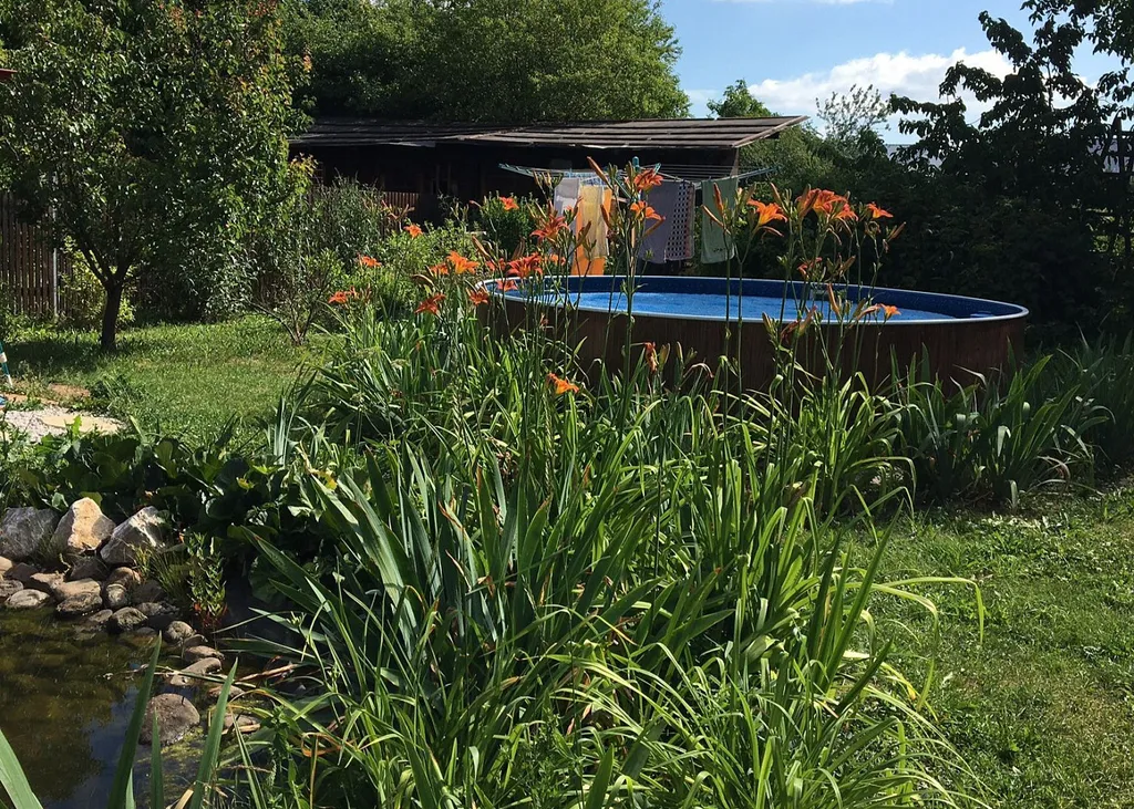 Zahrada rovinatá, okrasná s jezírkem, zahradním domkem a pergolou. Na zahradě bazén. Okrasná, pečlivě udržovaná zahrada skrývá mnoho druhů rostlin a plodících ovocných stromů a keřů.