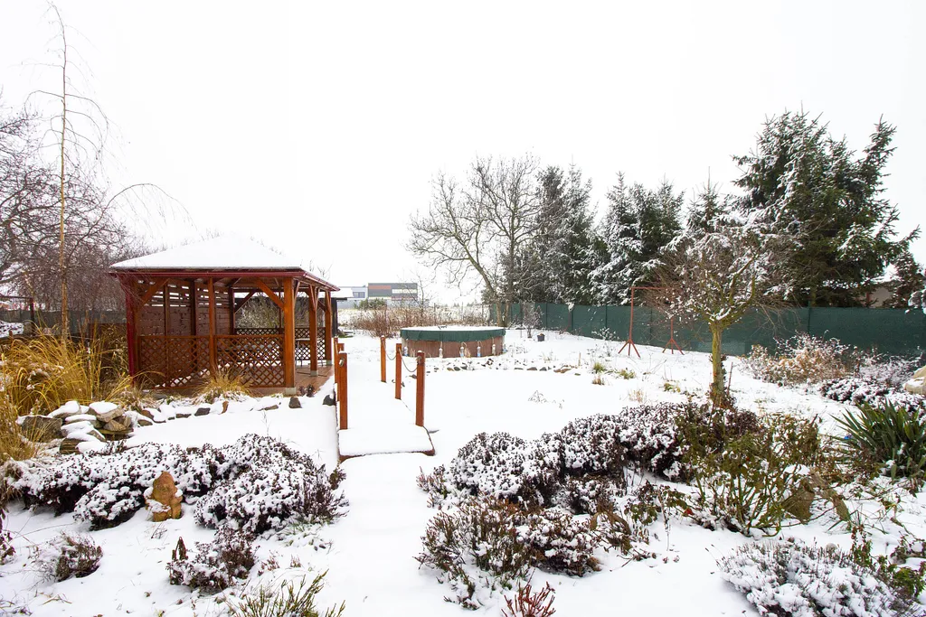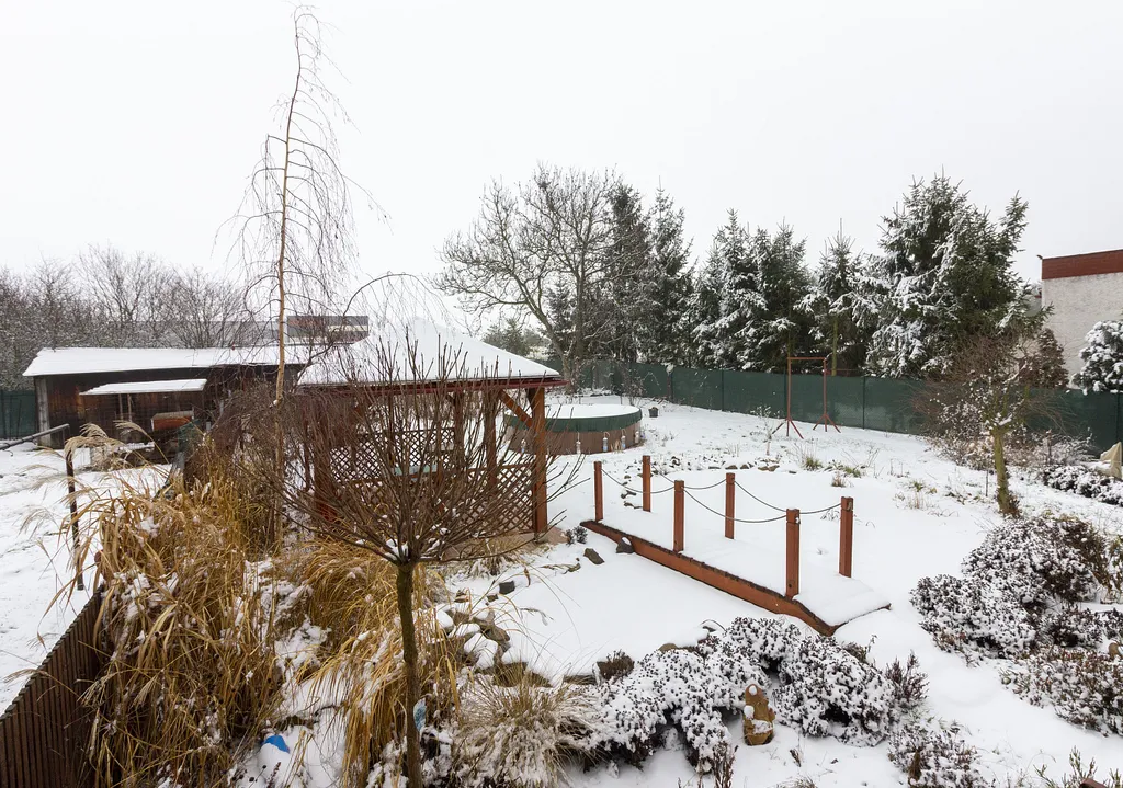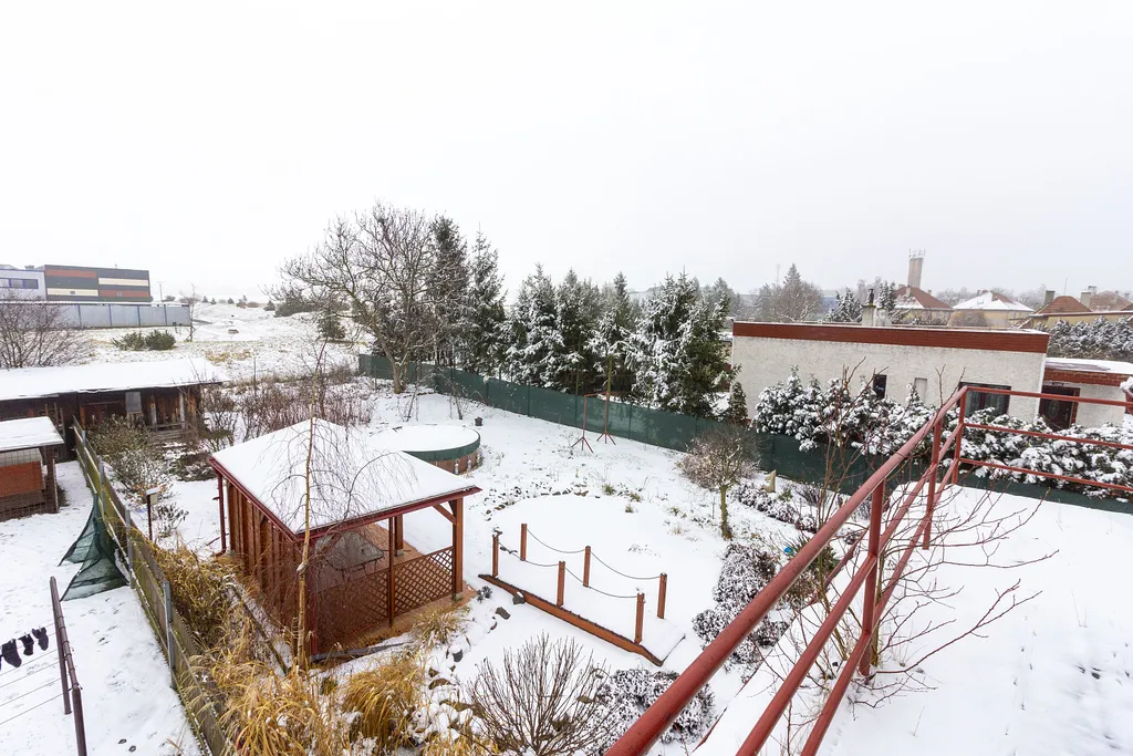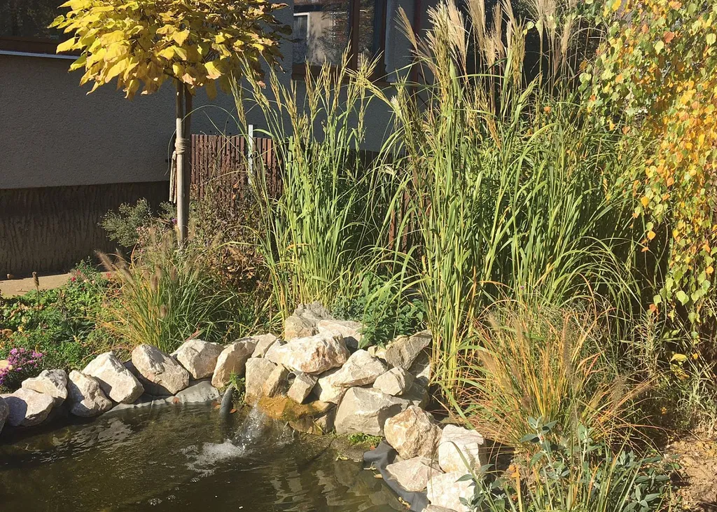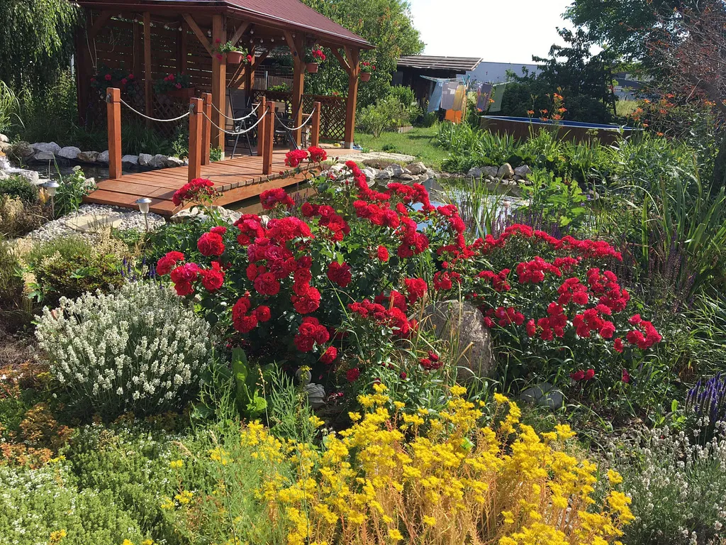 Zahrada rovinatá, okrasná s jezírkem, zahradním domkem a pergolou. Na zahradě bazén. Okrasná, pečlivě udržovaná zahrada skrývá mnoho druhů rostlin a plodících ovocných stromů a keřů.