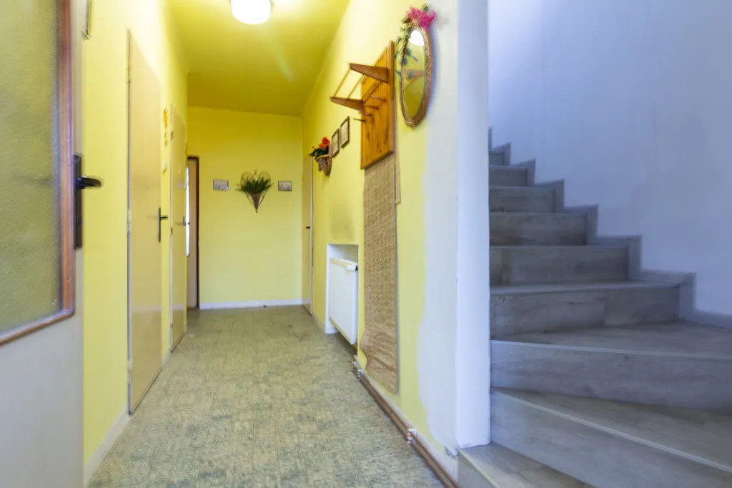 Při vstupu do domu chodba se zádveřím, vstup do obytné části je možno i ze sklepních prostor. Prostorná chodba se samostatnými vstupy do koupelny, WC, kuchyně a tří samostatných místností. Za kuchyní příruční spíž.