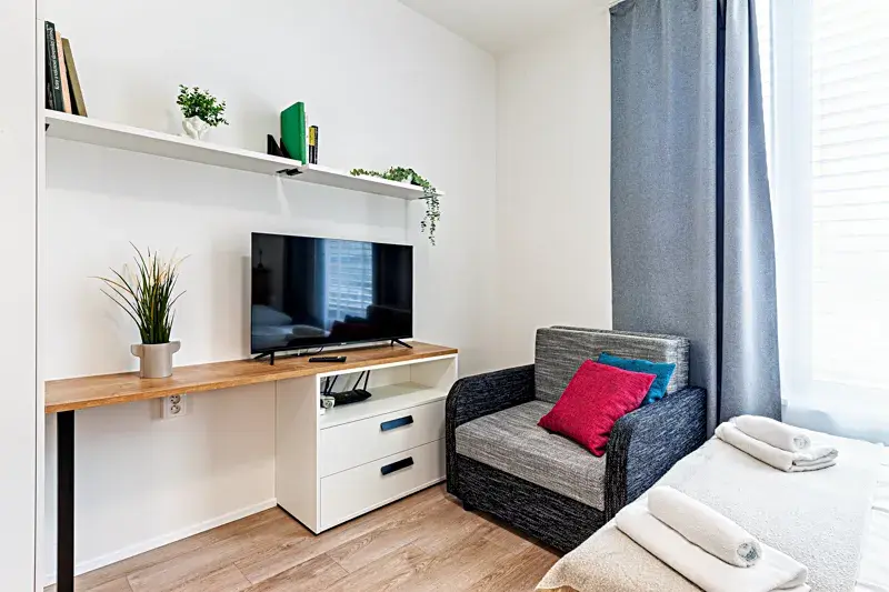Světlý obytný prostor s moderně integrovaným kuchyňským koutem a místem pro spaní i relaxaci.