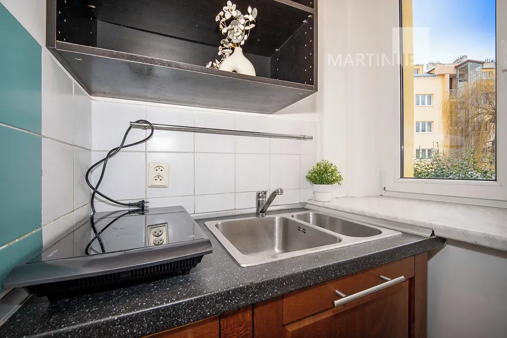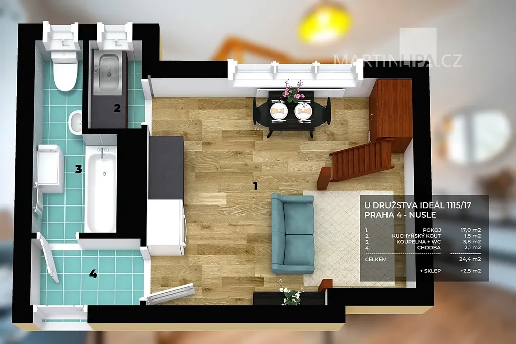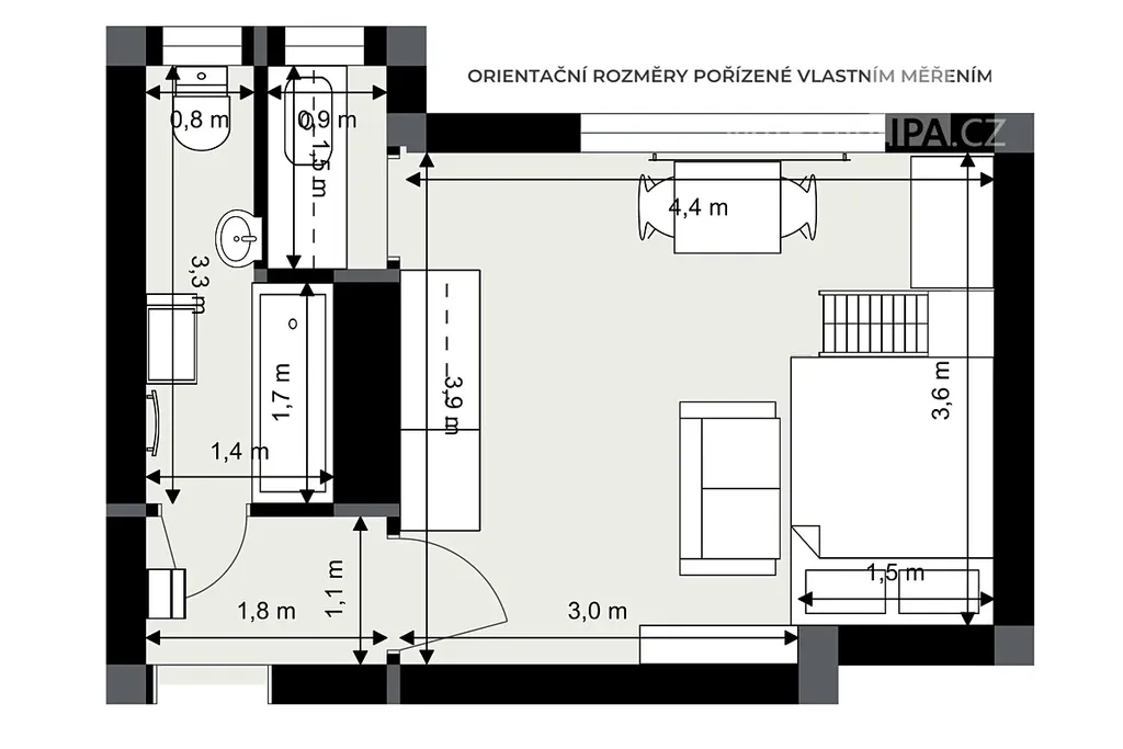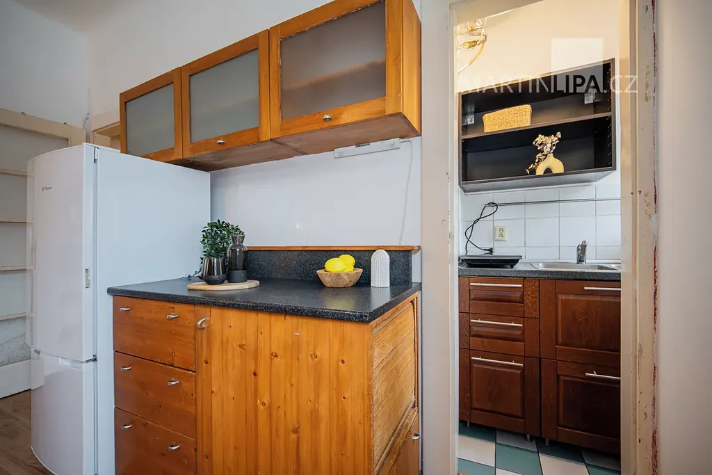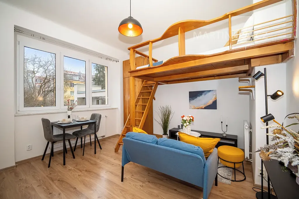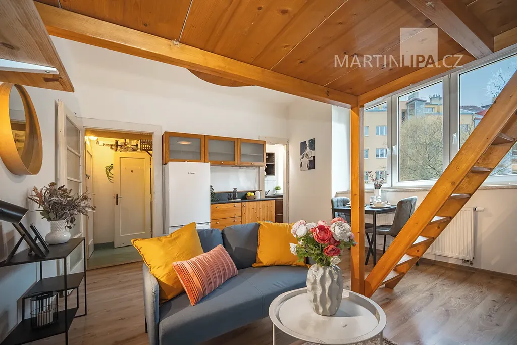 Pokud jde o byt samotný, na 24,4 m2 toho nevymyslíte tolik. Je to prostě garsonka s malým kuchyňským koutem a koupelnou. Pokud ovšem nemáte tak vysoké stropy (2,89 m v hlavní místnosti), že si postel umístíte do výšky a pod ní si zřídíte pěkný obýváček.