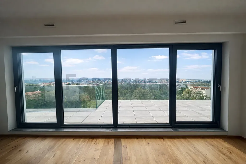Byt se nachází v 10. – posledním patře, což zajišťuje maximální soukromí, klid a naprosto jedinečný výhled na park i panorama Brna. Z každého pokoje vstup na terasu.