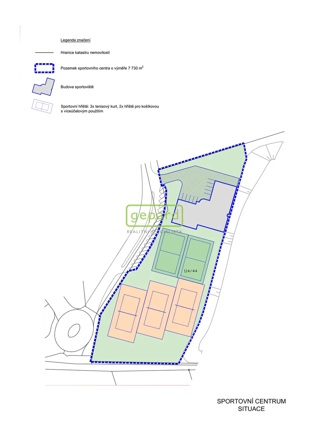 Realitní společnost Gepard nabízí k prodeji pozemek v oblasti Praha-západ, katastrální území Drahelčice, o výměře 7730 m2 s funkčním využitím „občanské vybavení - sport“ s územním rozhodnutím pro sportovní centrum a zázemí. Územním rozhodnutím je na pozemku možno umístit budovu sportoviště jako jednopodlažní nepodsklepený objekt s výškou do 12 m. Před budovou parkoviště pro provozovatele i obsluhu s celkem 10 parkovacími stáními. Územním rozhodnutím je dále možno umístit 5 venkovních sportovních hřišť (3 tenisové kurty a 2 hřiště pro košíkovou s víceúčelovým využitím), příjezdová komunikace a plochy zeleně.
