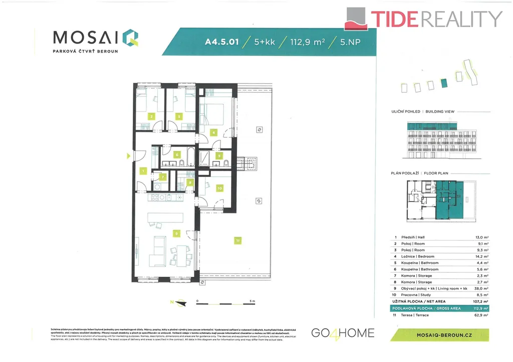 V novém rezidenčním projektu MOSAIQ Beroun Vám nabízíme tento prostorný byt 5+kk o podlahové ploše 113 m² + terasa 63 m², který je situovaný v 5. nadzemním podlaží komorní budovy A4. Tento rodinný byt tvoří prostorný obývací pokoj s kuchyňským koutem o rozloze 38 m², 3 ložnice, 2 koupelny, pracovna, šatna, předsíň a komora. Výška stropu, pouze v tomto podlaží, činí 3 m! K bytu náleží velkorysá terasa s orientací JVJZ o rozloze 63 m2. Standardní vybavení bytu zahrnuje plovoucí podlahy, interiérové dveře s výškou 210 cm, moderní vybavení koupelen, okna s barevným rámem a izolačním trojsklem, přípravu na vnější žaluzie. V bytech budou moderní datové rozvody formou strukturované kabeláže a přípojka STA. V projektu bude využita smart technologie pro vytápění, která pracuje se dvěma tepelnými zdroji – tepelnými čerpadly a zemním plynem. Dostatečná kapacita parkovacích míst převážně v podzemních garážích, ale i venku. Doplatek kupní ceny ve výši 85% je hrazen až po kolaudaci (2027).