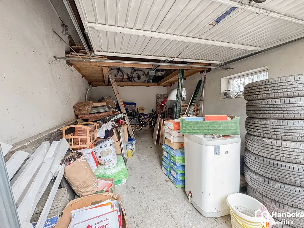Součástí garáže je dřevěný úložný ochoz o ploše cca 5 m², který poskytuje praktický prostor navíc. Další výhodou je podzemní úložný prostor (viz foto), vhodný například pro uskladnění sezónních věcí. Garáž je vybavena automatickými elektrickými vraty s dálkovým ovládáním a je zde zavedena elektřina 230 V.