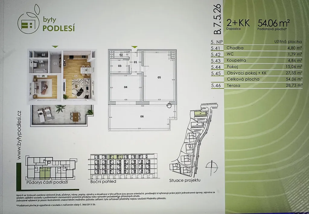Dlouhodobý pronájem zcela nového bytu 2+kk (54 m²) s obdivuhodnou terasou v posledním podlaží (5.nadzemním podlaží) bytového domu B7 – okraj výstavby -kolaudace proběhne v tomto měsíci. V ceně nájmu je již zahrnuto 1 vyhrazené kryté parkovací stání. Jižní orientace terasy (29 m²) nabízí vstupy z obou pokojů, jedinečný prostor pro relax a veškerý komfort moderního bydlení, kdy na terase budou předem připraveny konstrukce pro růst vlastních popínavých rostlin. Samotný obývací pokoj (28 m²) s moderní kuchyňskou linkou v bílo-šedém designu, neprůchozí ložnice (15 m²), koupelna s vanou, WC zcela odděleno. K dispozici je bezpečná a prostorná sklepní koje nadstandardní velikosti 7,23 m² včetně jednoho krytého parkovacího stání. Součástí výstavby bude dokonalá parková úprava rezidenčního bytového komplexu – nově přiznaný tok potoka s lávkami, malý biotop, vybudovaná cyklostezka, bike park, gril pointy, dětské hřiště s prvky venkovní posilovny.