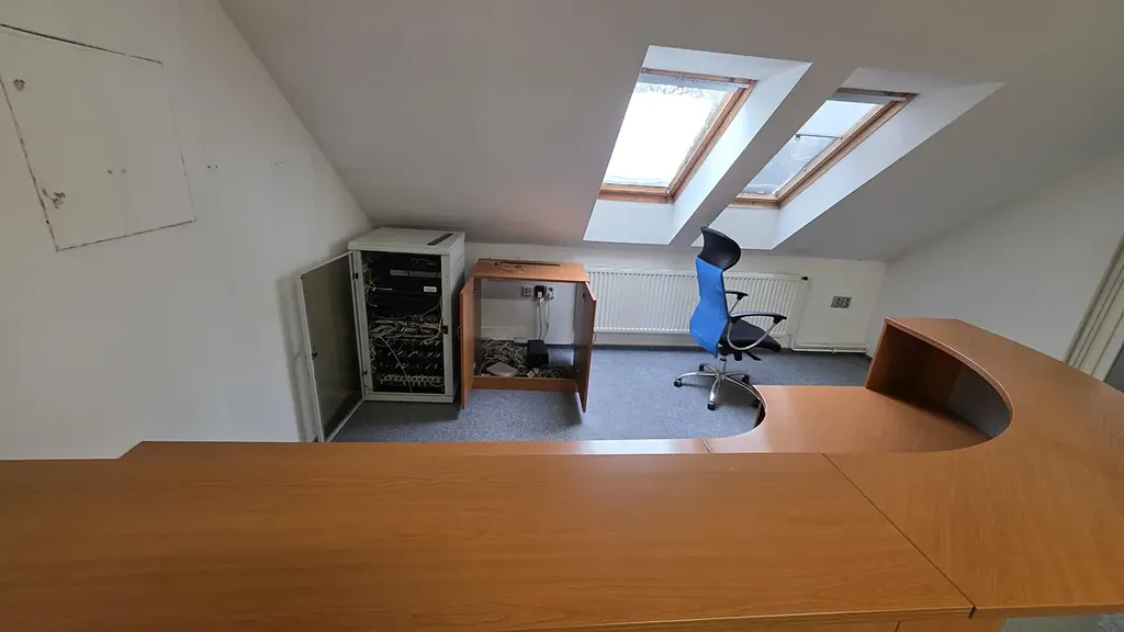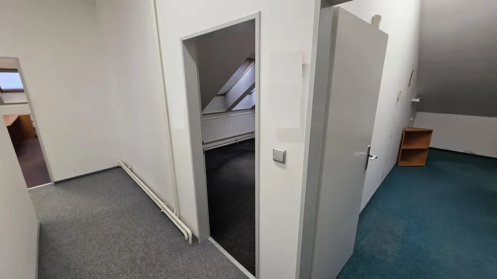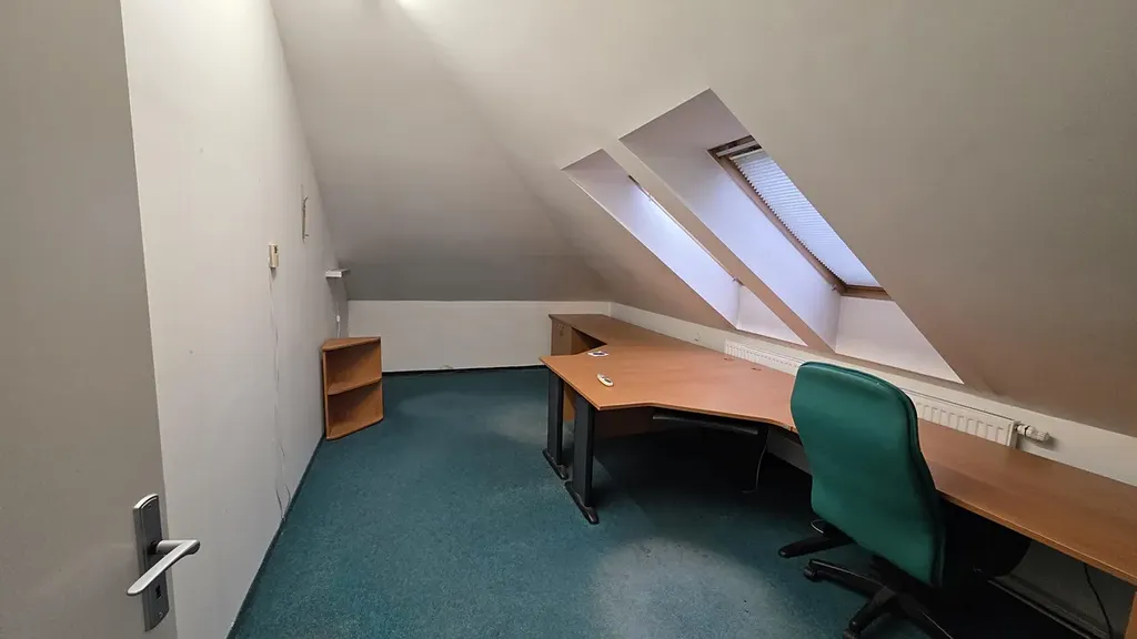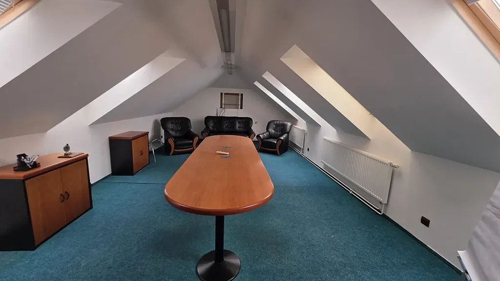 - Nad prvním patrem naleznete nadstavbu s částečně šikmými stěnami. Tento prostor byl užíván jako kancelář či zasedací místnost, je dostatečně prosvětlen střešními okny a přístupný po točitém schodišti.