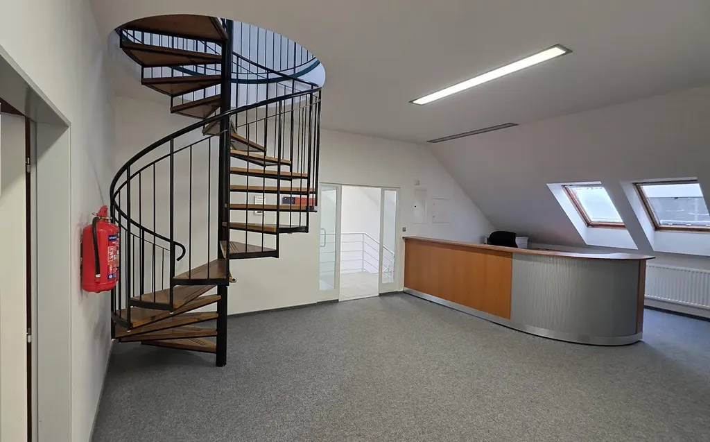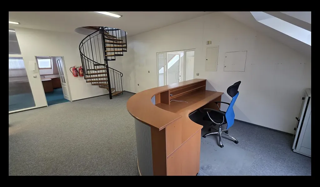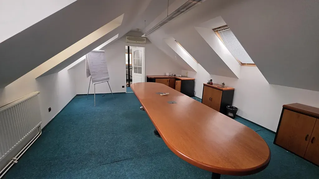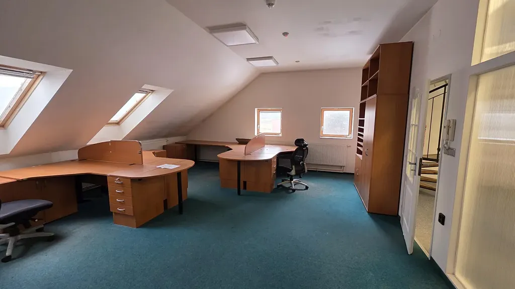 - Nad prvním patrem naleznete nadstavbu s částečně šikmými stěnami. Tento prostor byl užíván jako kancelář či zasedací místnost, je dostatečně prosvětlen střešními okny a přístupný po točitém schodišti.
