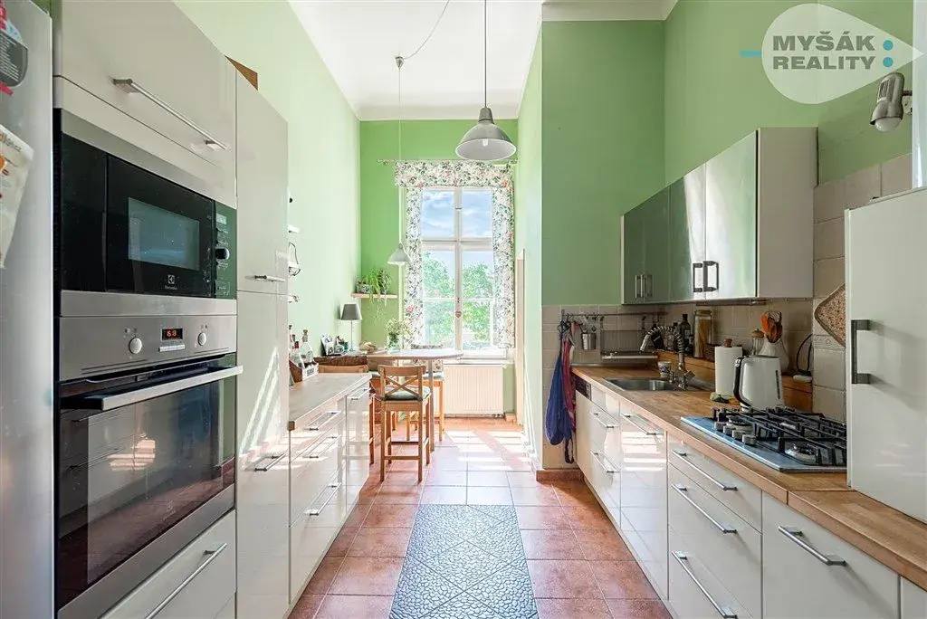 Byt se nachází v prvním patře domu bez výtahu a je koncipován jako 3+1 o ideální výměře 102m2. Je částečně zrekonstruovaný, s novým plynovým kotlem pro topení i ohřev vody. V koupelně s oknem je sprchový kout.