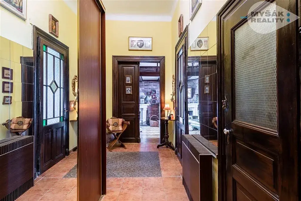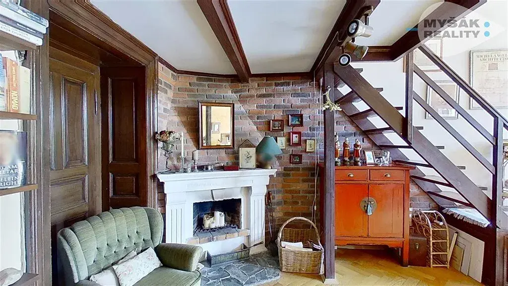 V bytě jsou zachovány původní prvky jako dřevěné obložení dvojitých oken, funkční krb a kachlová kamna. Stejně tak dřevěné dvoukřídlé dveře s ozdobnými zárubněmi, parkety a 3,8 metru vysoké stropy.