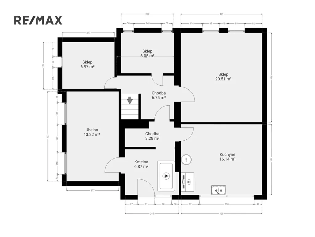 Suterén (80 m2): chodba a 6 místností – černá kuchyně, kotelna, sklad uhlí a další skladové prostory.